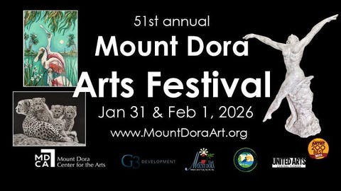 Join us on Jan 31 & Feb 1, 2026 for the 51st annual Mount Dora Arts Festival held on the streets of historic downtown Mount Dora, Florida. Experience 300 fine artists lined along the streets to showcase a vast array of incredible talent in this juried event. There will be entertainment, beer, wine, cocktails, music and festival food to round out the amazing weekend. The event runs 9am-5pm on Saturday and 9am-4pm on Sunday and is FREE to attend.