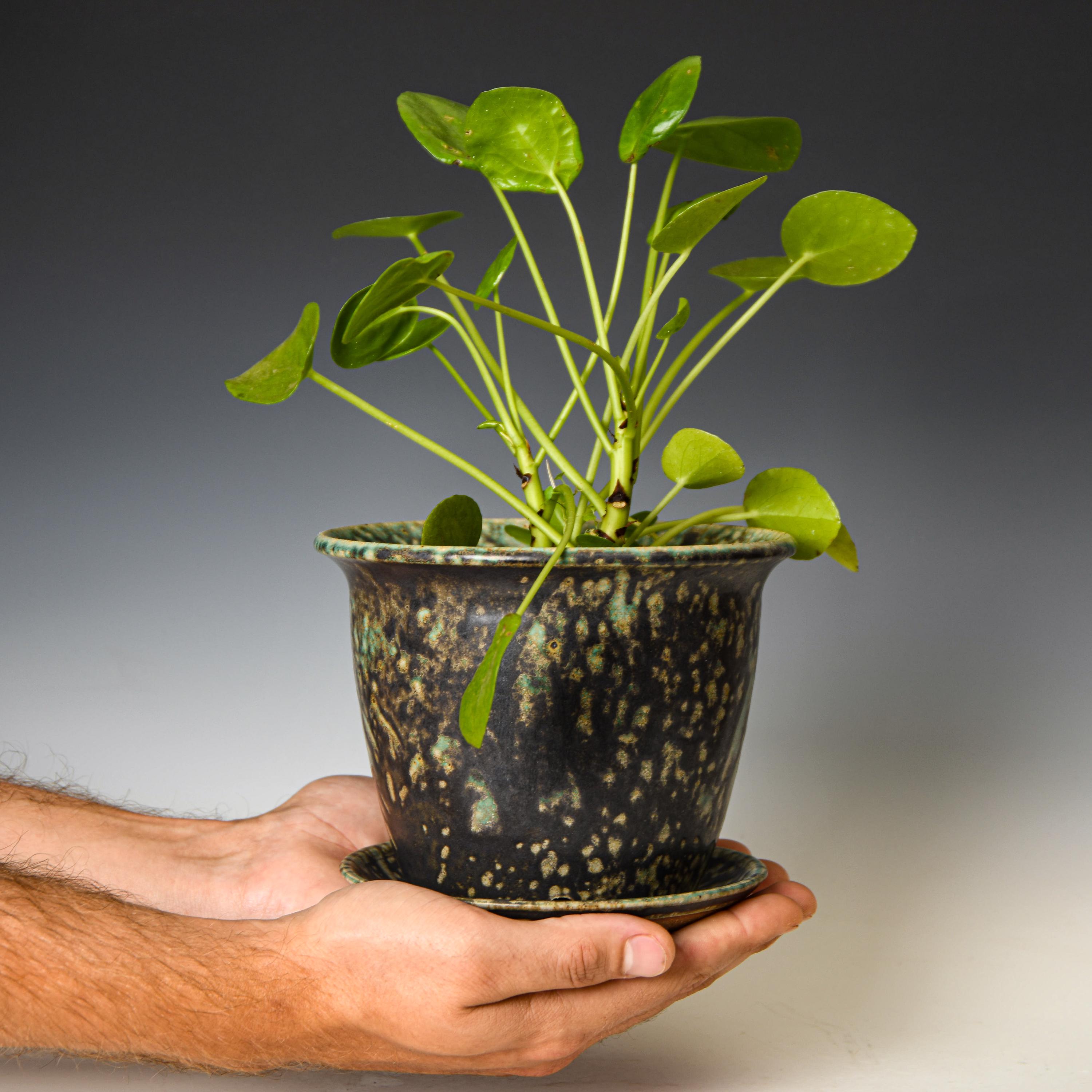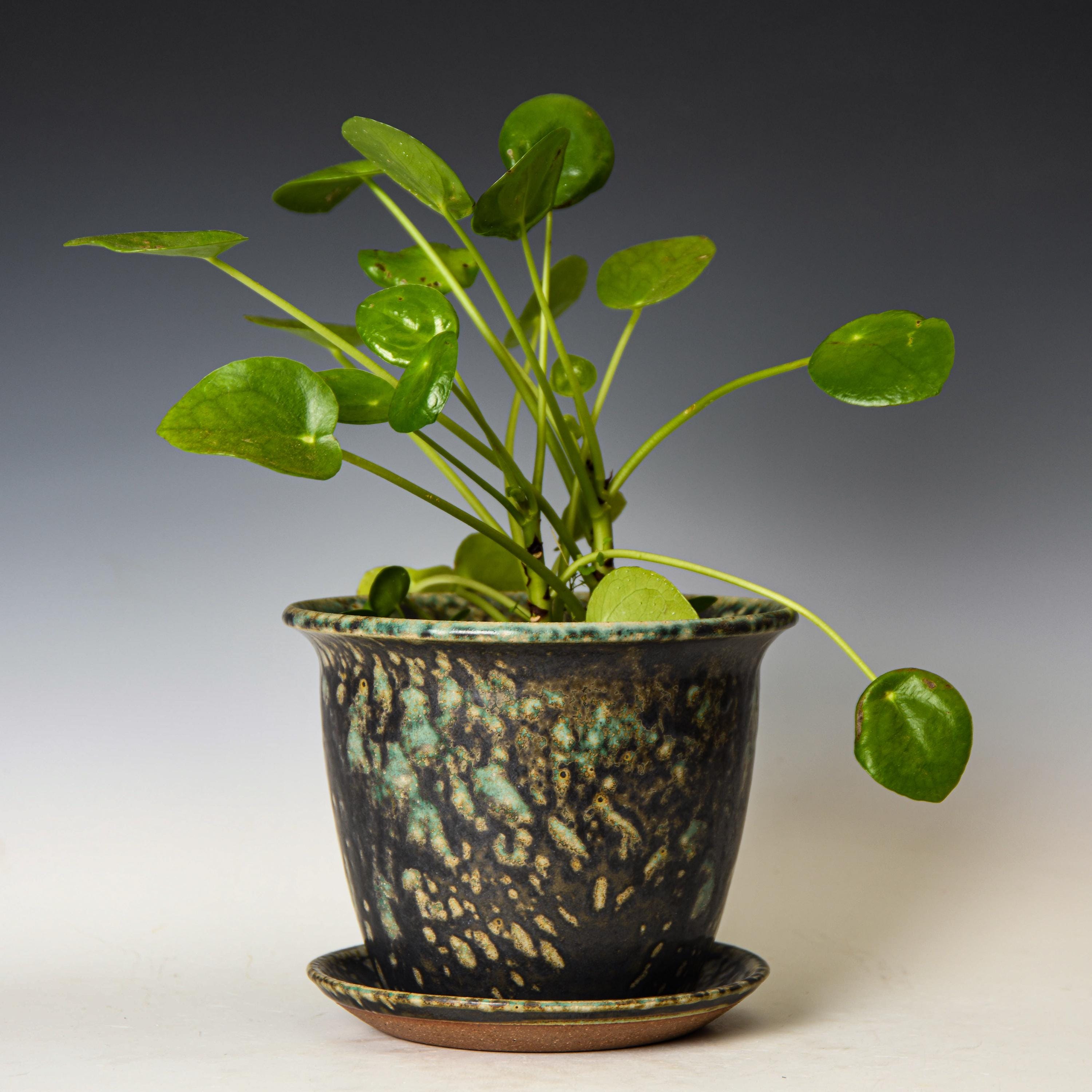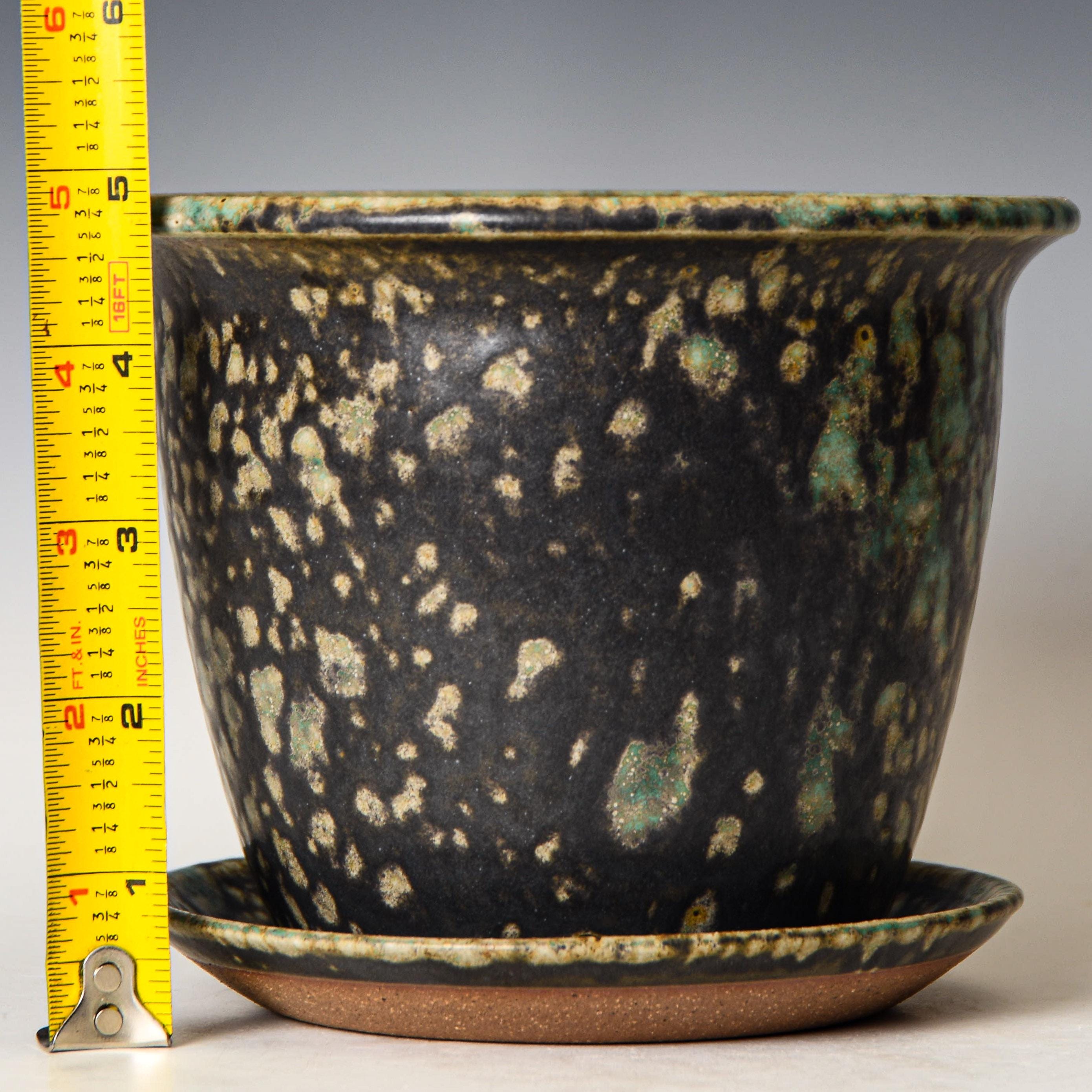 This planter has drainage holes & an attached water catch dish.