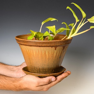 This planter has drainage holes & an attached drain dish.