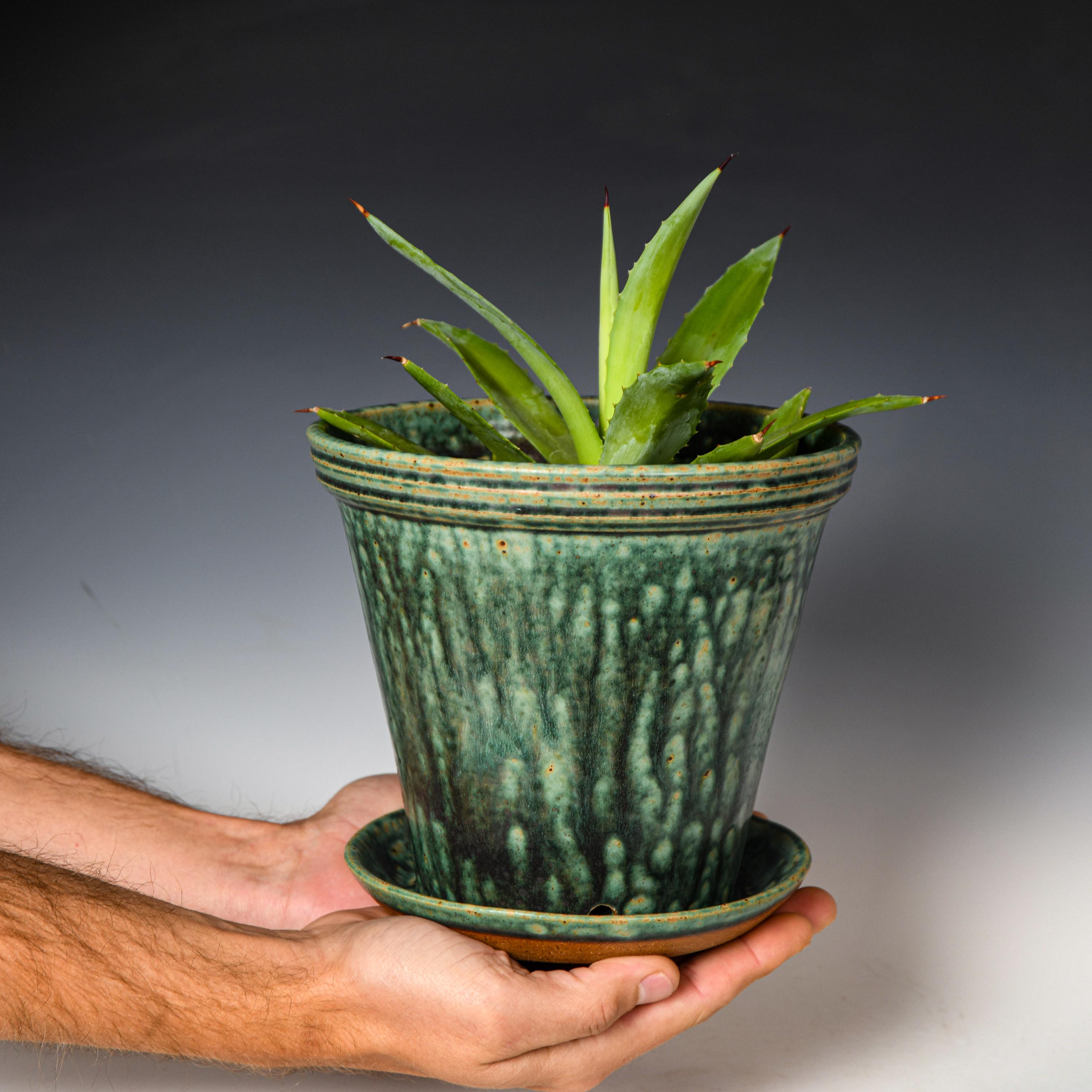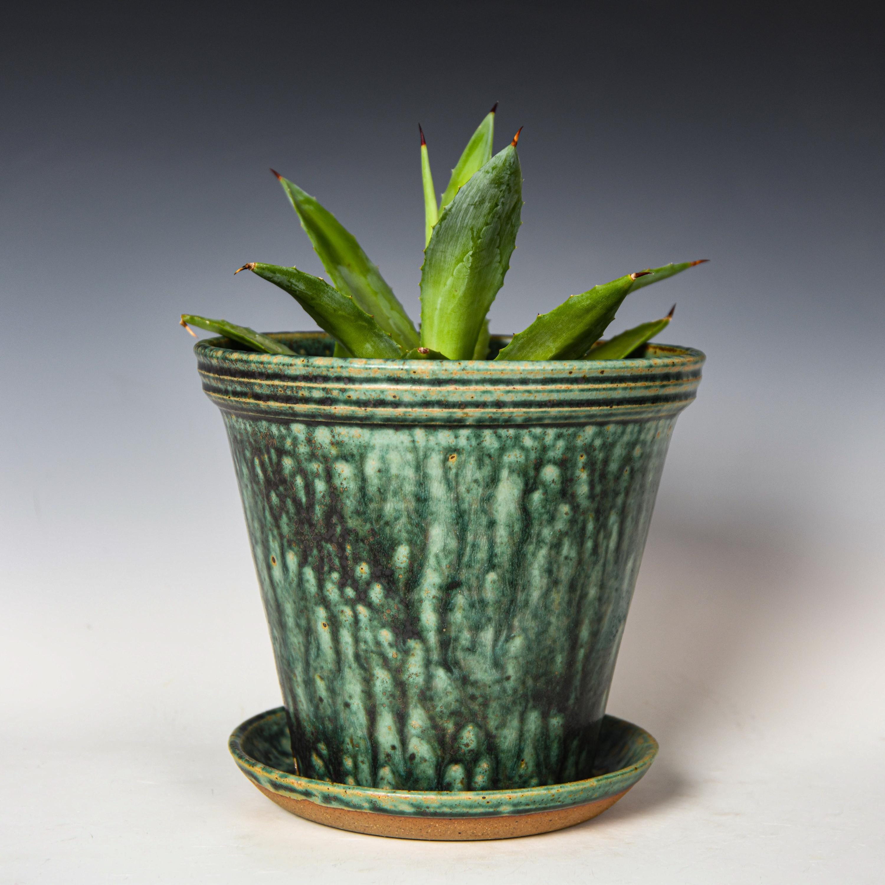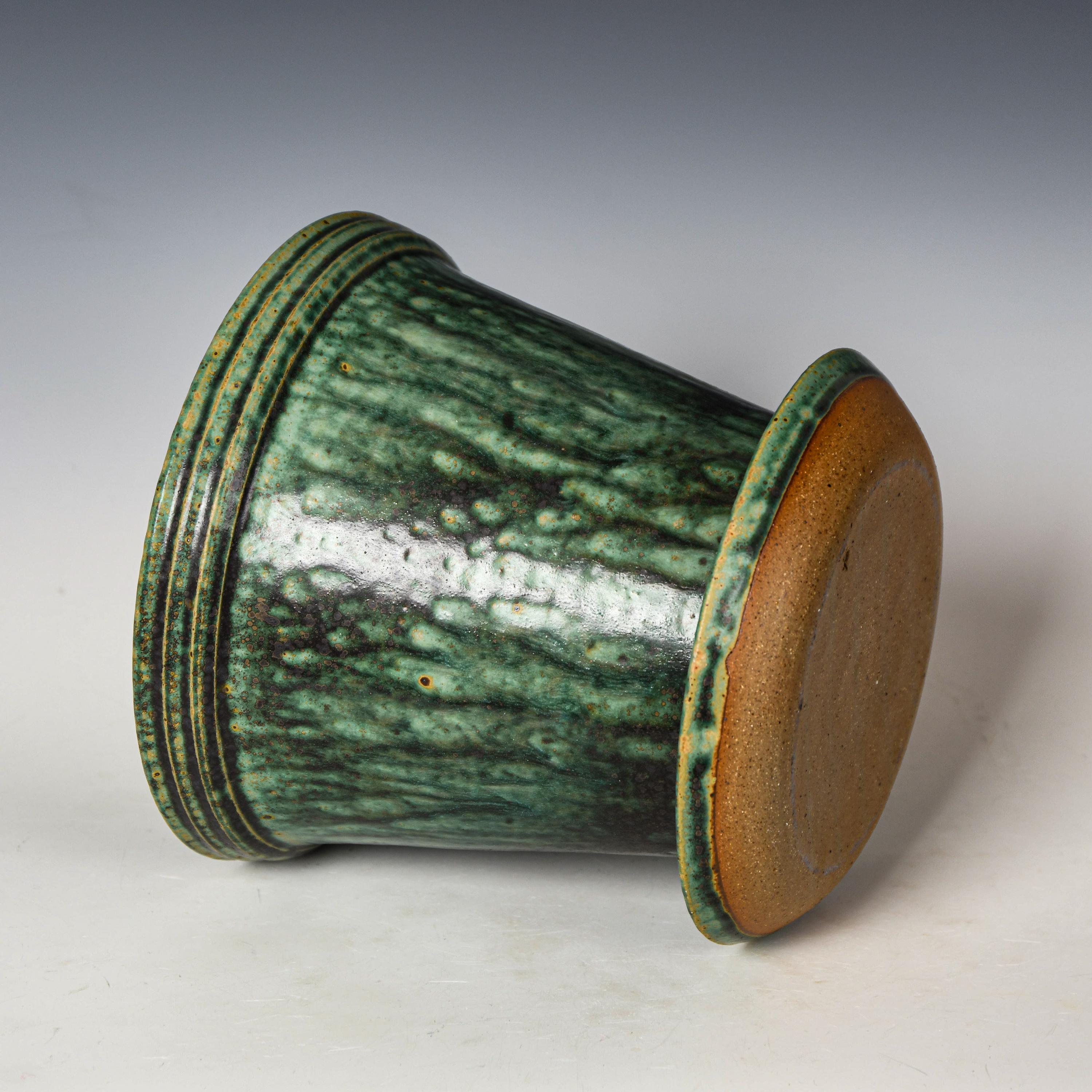 Wheel Thrown Planter with Drainage Holes in Green Glaze, Stoneware Plant Pot #752