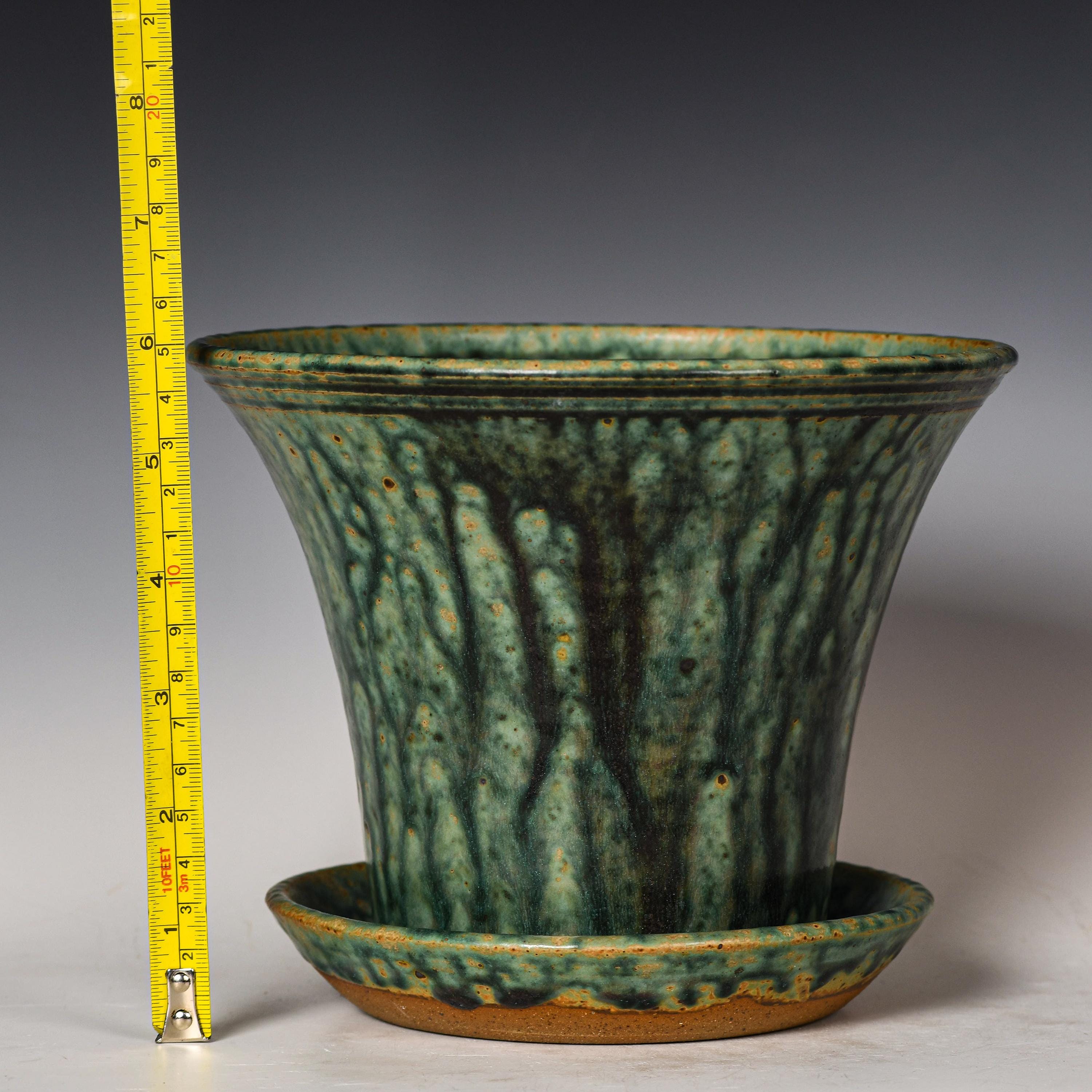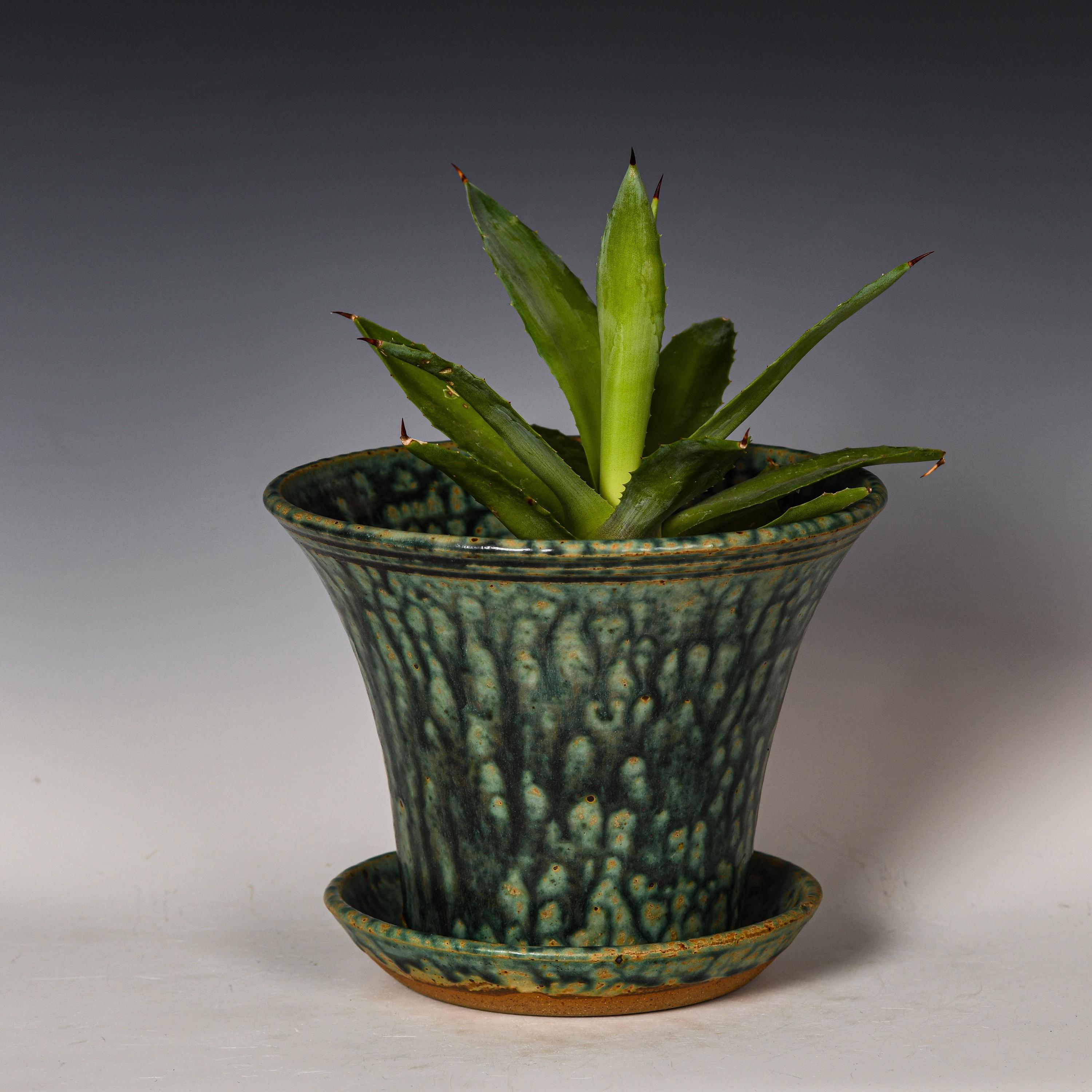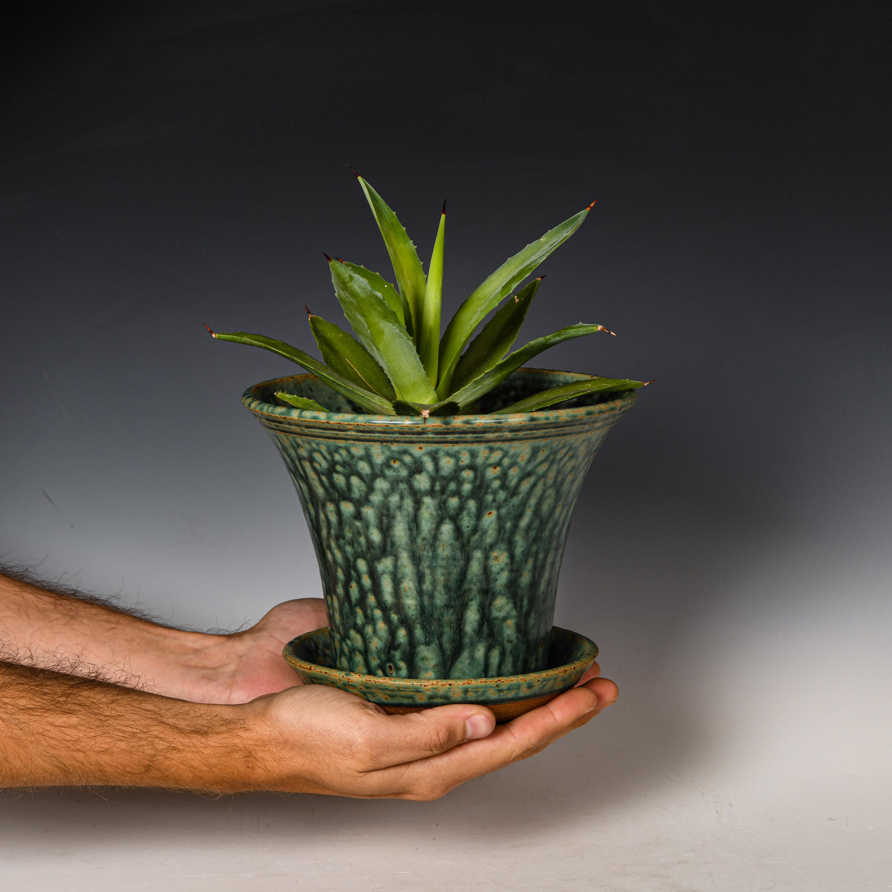 Ceramic Planter with Drainage Holes in Green Glaze, Stoneware Plant Pot #773