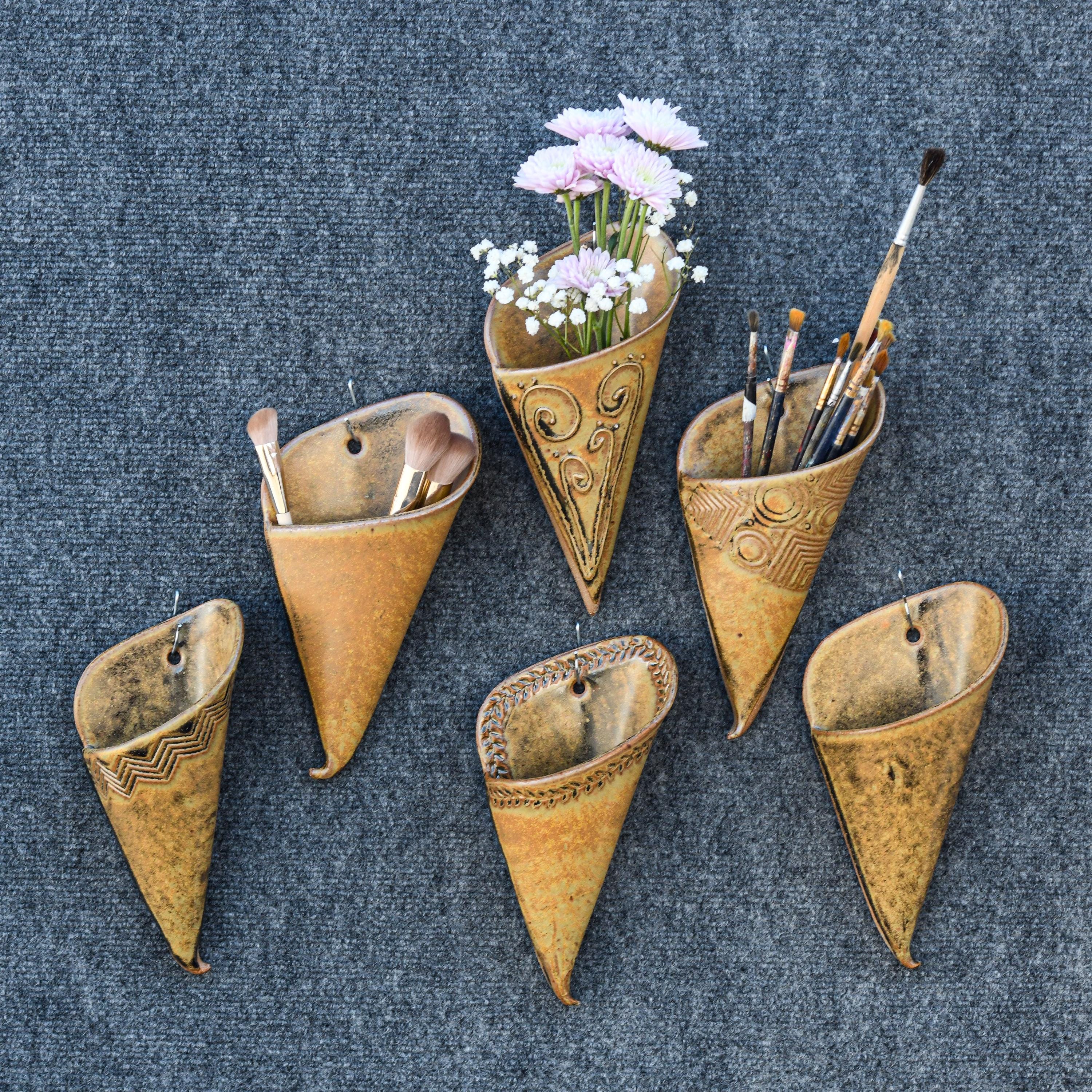 These hand-built wall cones are a new creation this year from Tyler! Perfect for showcasing dried or freshly cut flowers; these wall cones can hold water. They’re also incredibly versatile as a storage vessel. You can use them for your make up brushes, paintbrushes, lighters or matches near your fireplace. You can even use them as a cute home for your succulents and air plants! So many possibilities.